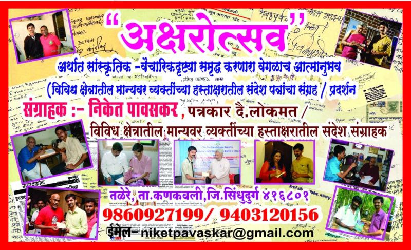 अक्षर म्हणजे कधीही ‘क्षर’ न होणारा असा म्हणजे कधीही न संपणारा ठेवा आहे. जगातल्या नावाजलेल्या माणसांच्या हस्ताक्षरांचा छंद असणे हे आपल्या सांस्कृतिक उंचीचे प्रतिक आहे. विदेशातीलसुध्दा मोठ्या हस्तींच्या हस्ताक्षरांचा ठेवा आपल्या संग्रहात वाढो / राहो, हि ईश्वरचरणी प्रार्थना! अशा प्रदर्शनातून अनेक छांदिष्ट विद्यार्थी शाळाशाळांतून तयार होवोत.